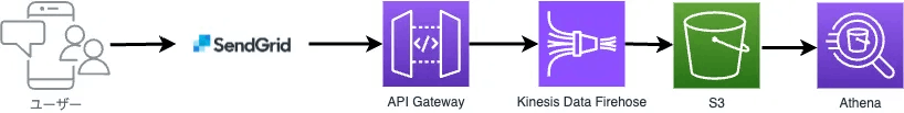 下図がイベントデータの流れです。Sendgrid Event WebhookとAWSの各種サービスを使って組んでいます。