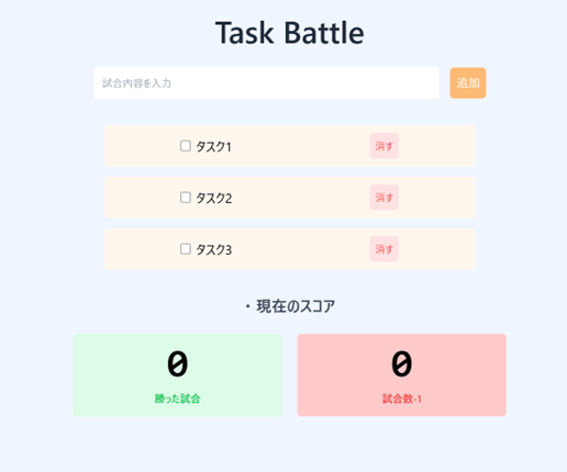 「タスクをバトル(試合)」と見立てて、タスクを完了したら勝ちとし、勝った試合ラベルの上にあるスコアが1ずつ加算されます。また、タスクを2つ以上設定すると試合数-1ラベルの上にあるスコアが1ずつ加算されるようになっています。