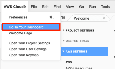メニューAWS Cloud9 > Go To Your Dashboardを選択します。