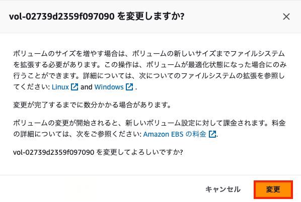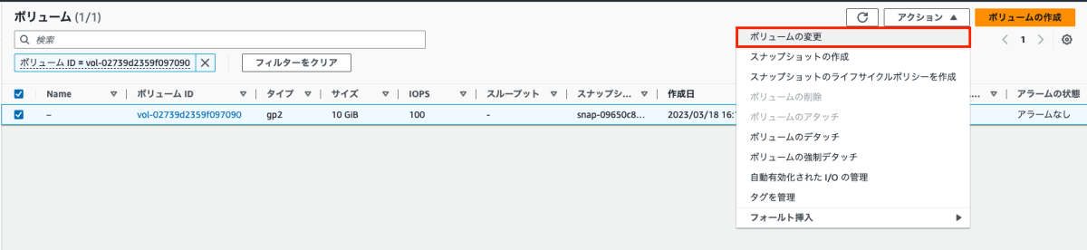対象のボリュームを選択したら、アクション > ボリュームの変更をクリックします。