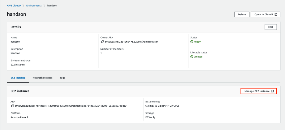 EC2 インスタンスを編集したいので、Manage EC2 instanceボタンをクリックします。