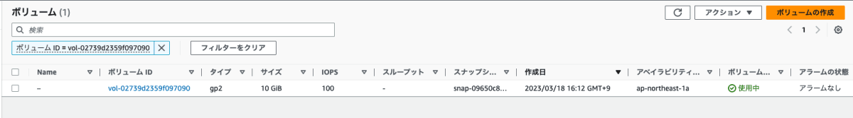 ボリュームの画面に遷移するので、対象のボリュームを選択し、ボリュームのサイズを変更していきます。