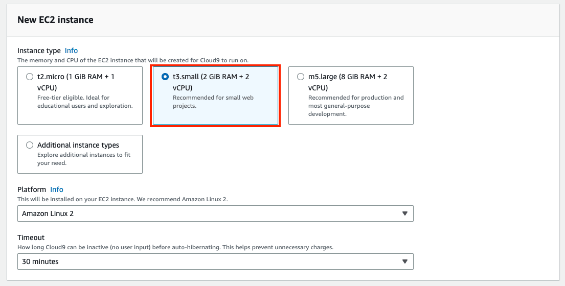 t2.microだとメモリ不足になる可能性があるとのことで、t3.smallを選択します。