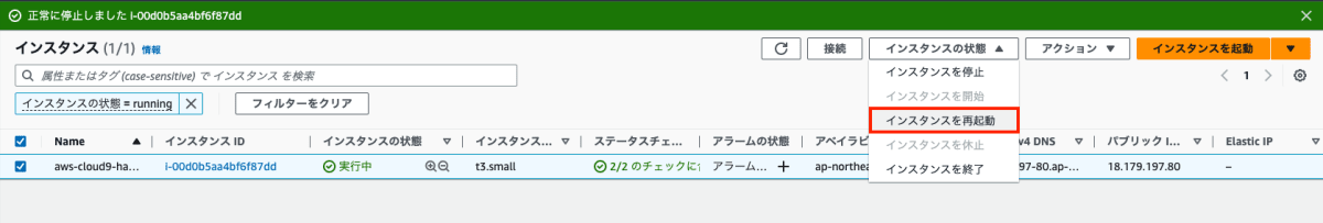 EC2 ダッシュボードに戻って、EC2インスタンスを再起動します。