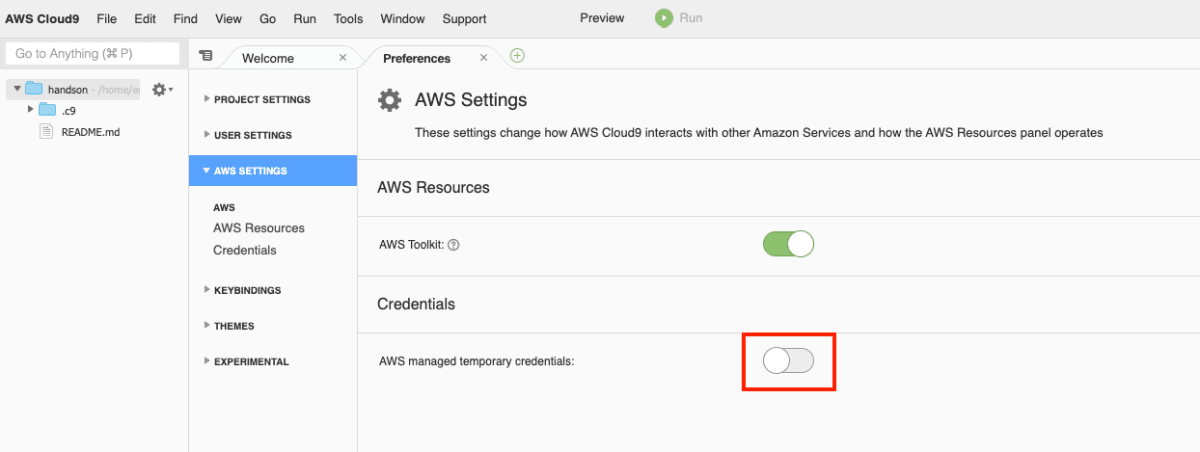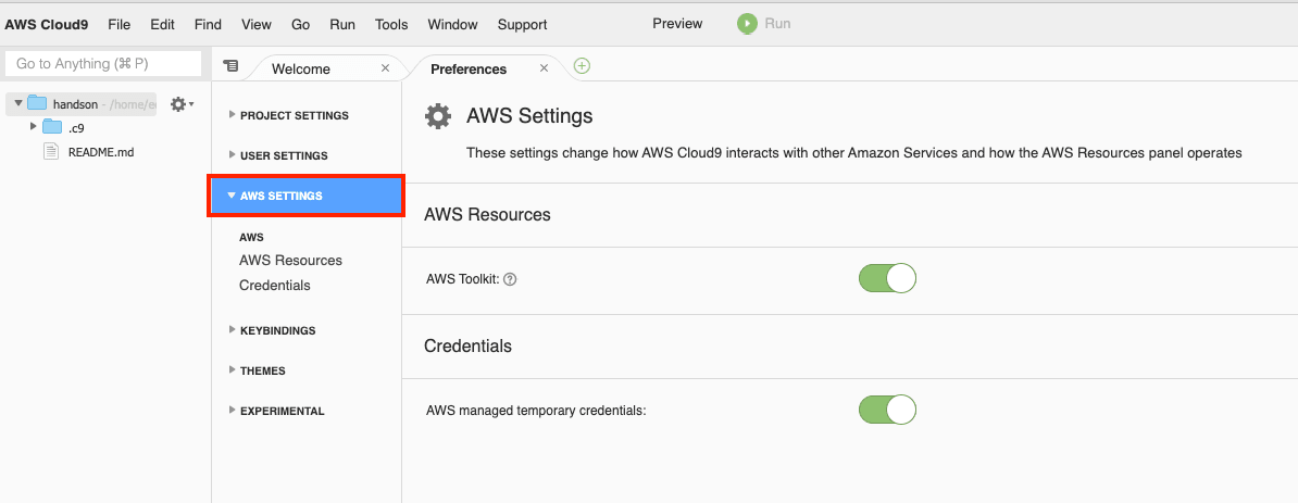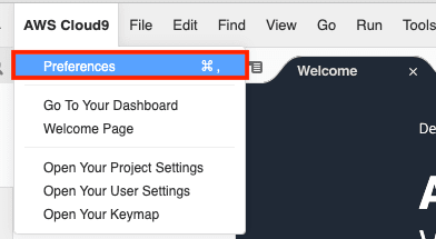 Cloud9の画面左上にあるメニューAWS Cloud9 > Preferencesを選択します。