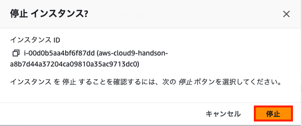インスタンスを停止してよいかどうかを聞かれるので、停止ボタンをクリックします。