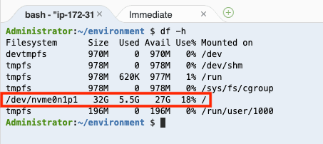 EBS ボリュームの引き上げが完了したので、ターミナルから、ボリュームが引き上げられたことを確認していきます。