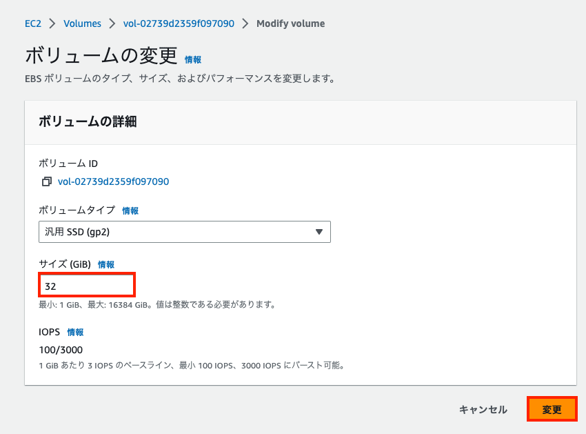 10GB → 32GB に変更し、変更ボタンをクリックします。