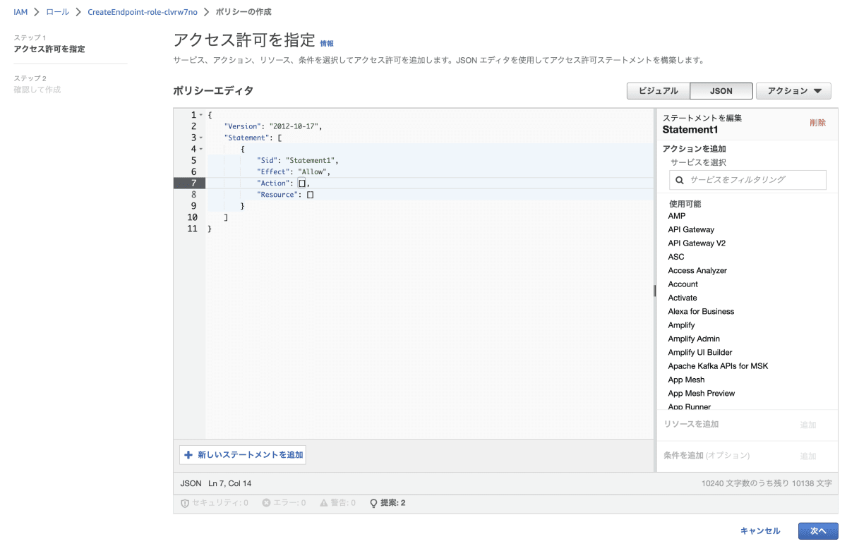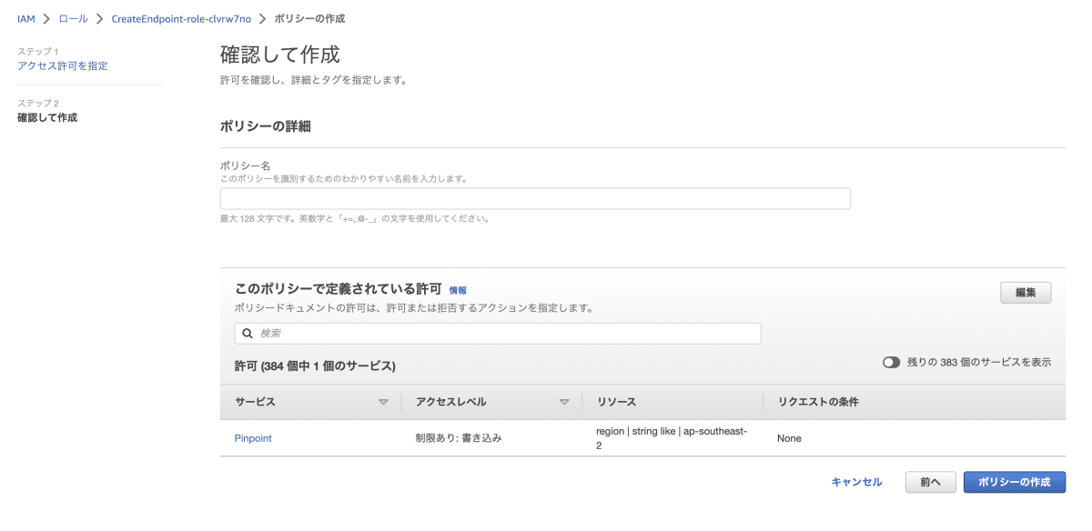 Amazon Pinpointのプロジェクトに対してAWS Lambda Functionがupdate_endpoint操作を実行できるようにする必要があるため、IAMポリシーを追加していきます。