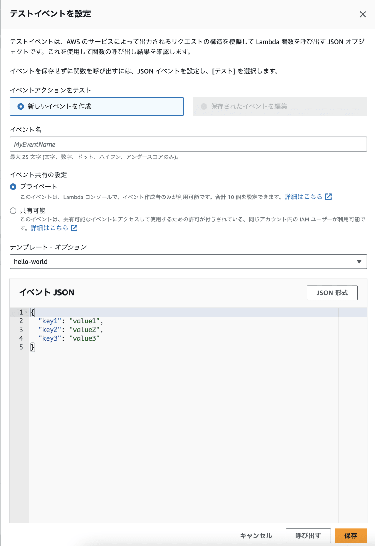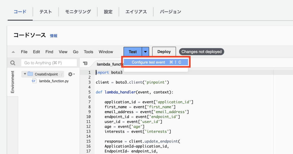 コードにあるTestボタンのドロップダウンを選択し、Configure test eventを選択します。