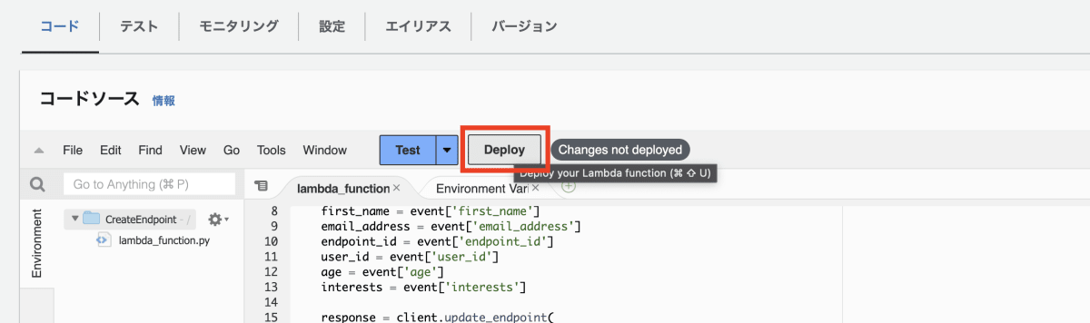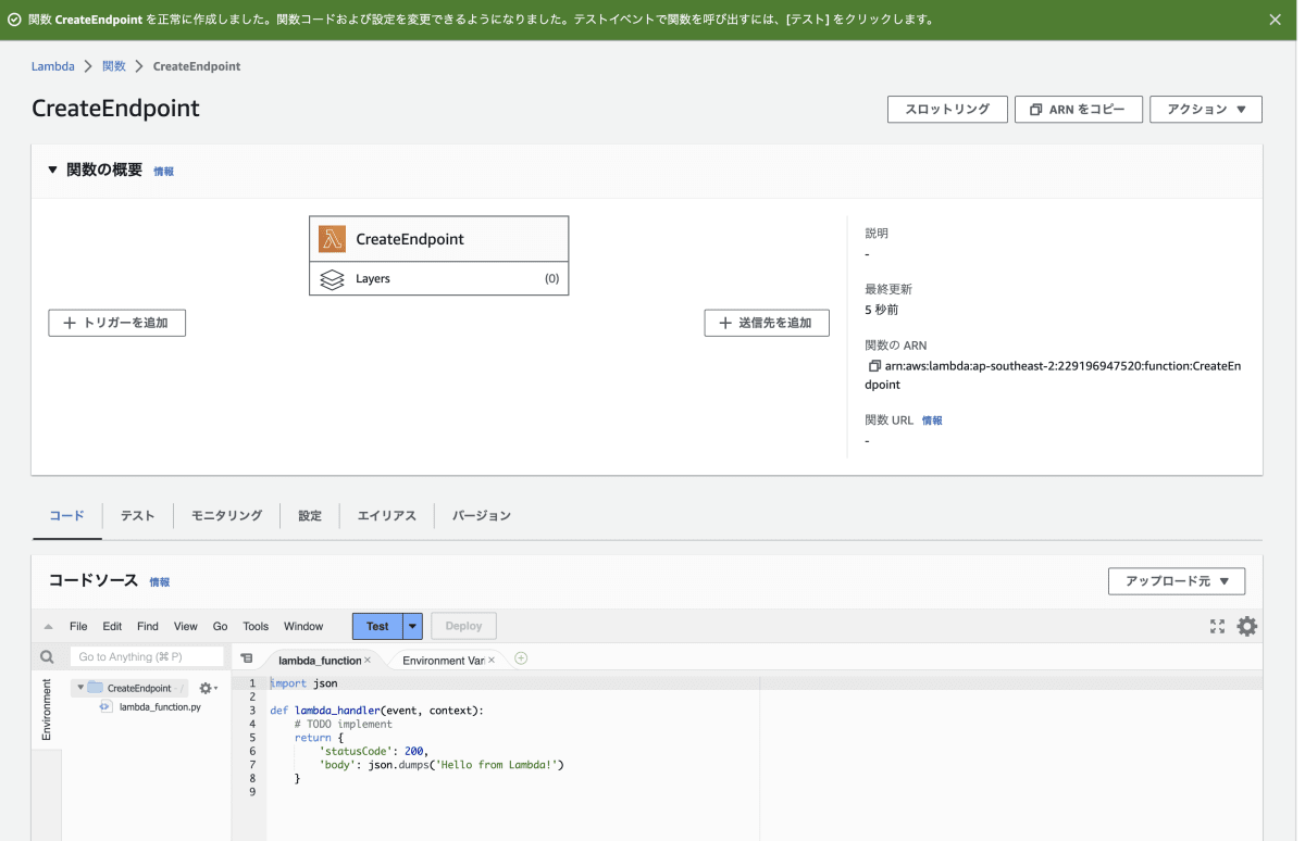 というわけで、Lambda Functionからエンドポイントの作成を行ってみました。