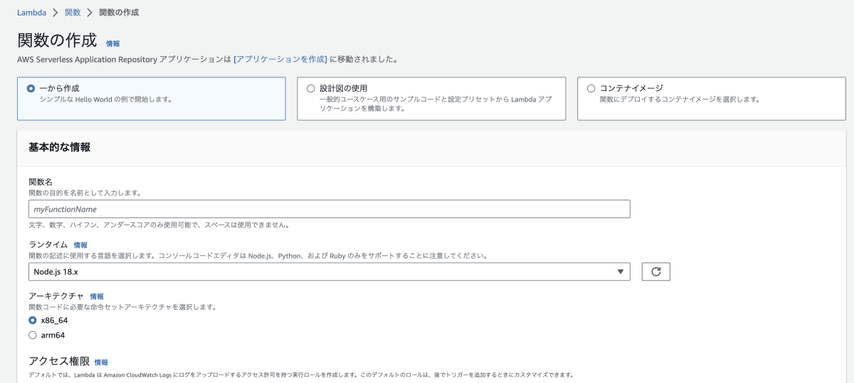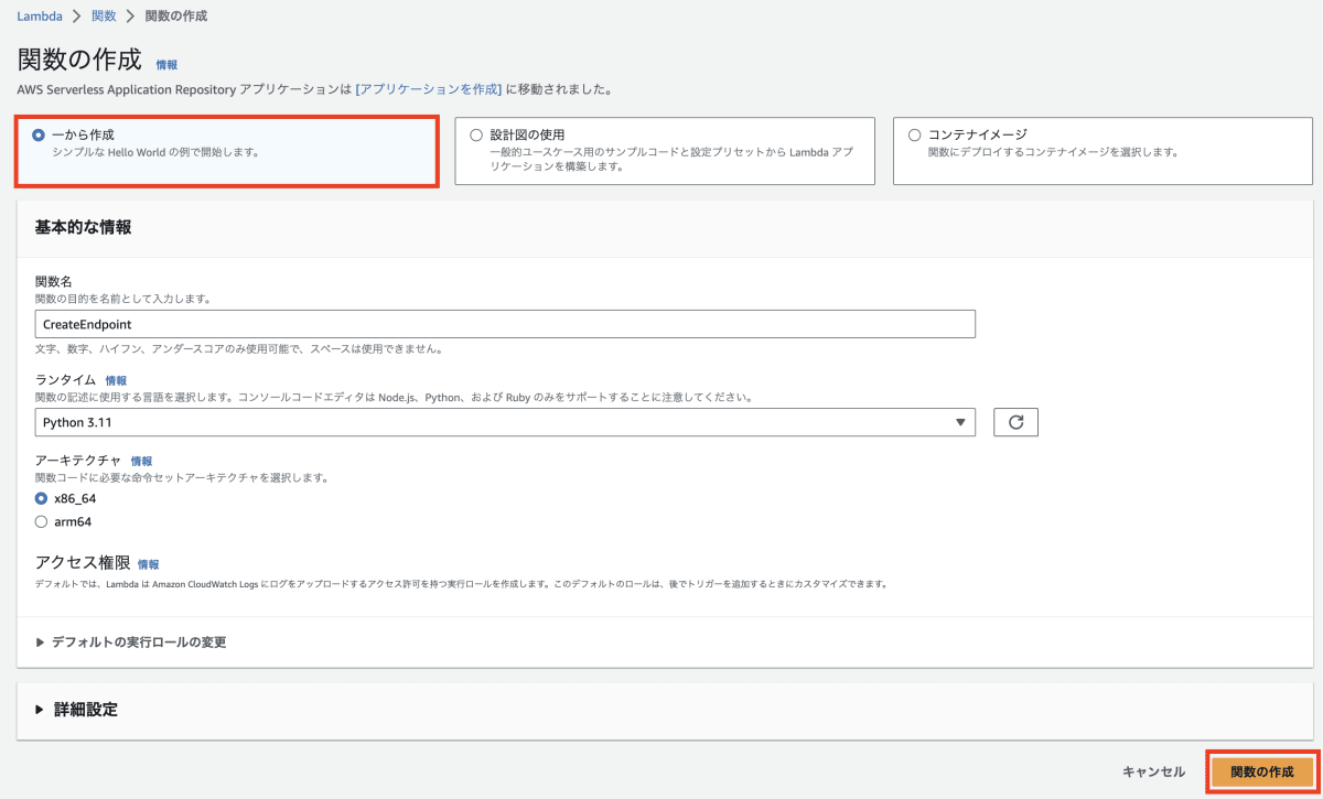 一から作成を選択し、任意の関数名をつけ、ランタイムにはPython3.11を選択し、関数の作成ボタンをクリックしていきます。