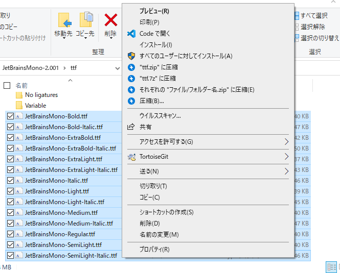 解凍したZIPファイルのttfフォルダにあるすべてのフォントファイルを選択し、ダブルクリックする。