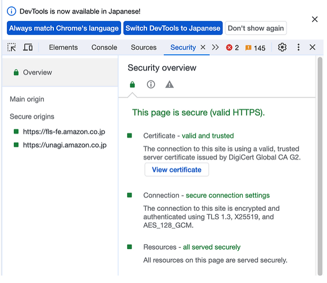 あるWebサイトのサーバ証明書はそのページで右クリック > 検証 > Securityタブ > View certificate で見られます(Google Chromeの場合)