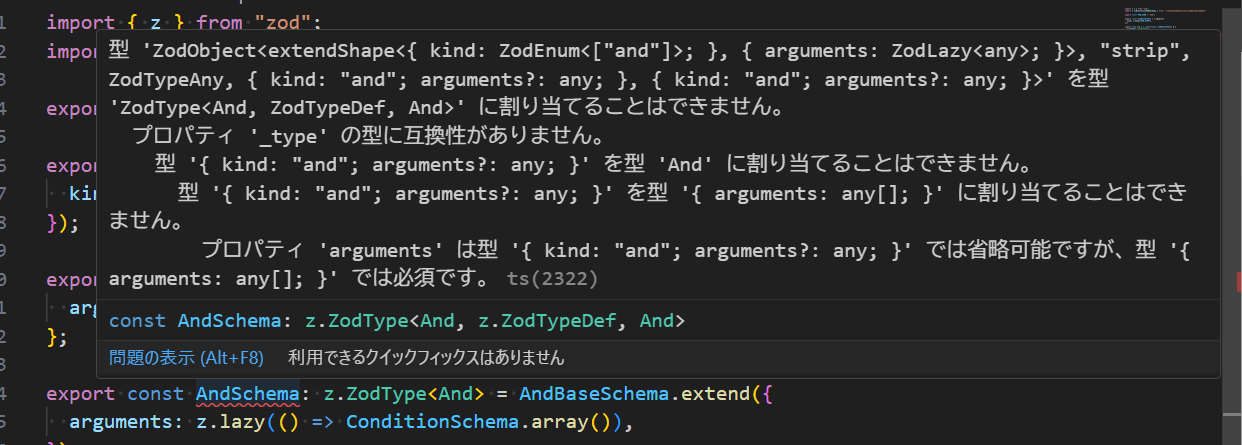 型 'ZodObject<extendShape<{ kind: ZodEnum<["and"]>; }, { arguments: ZodLazy<any>; }>, "strip", ZodTypeAny, { kind: "and"; arguments?: any; }, { kind: "and"; arguments?: any; }>' を型 'ZodType<And, ZodTypeDef, And>' に割り当てることはできません。