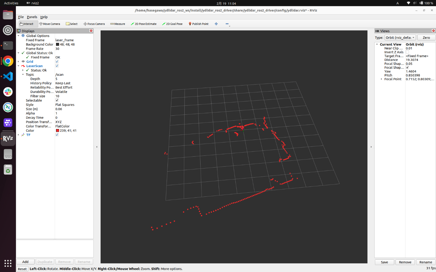LiDARノードを起動し、rviz2でLaserScanを確認する場合: