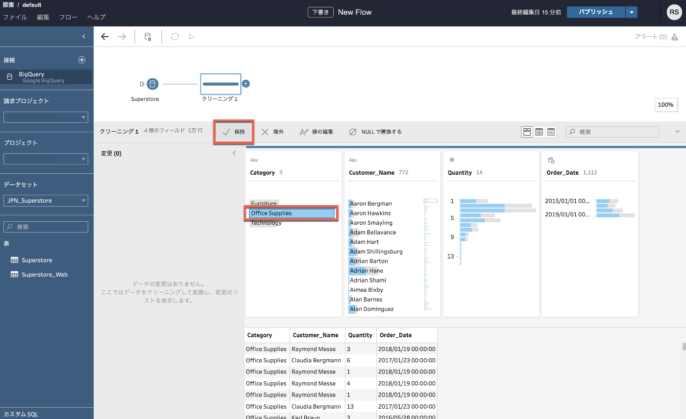 Tableau Prep のクリーニングステップで、Category のOffice Supplies のみをフィルターします。BigQuery のクエリ履歴を参照すると、新規のクエリは発行されていませんでした。(2) 、(3) で実行した結果をTableau Prep 内でキャッシュし、ローカルのテンポラリHyper を利用して処理をかけていることがわかります。