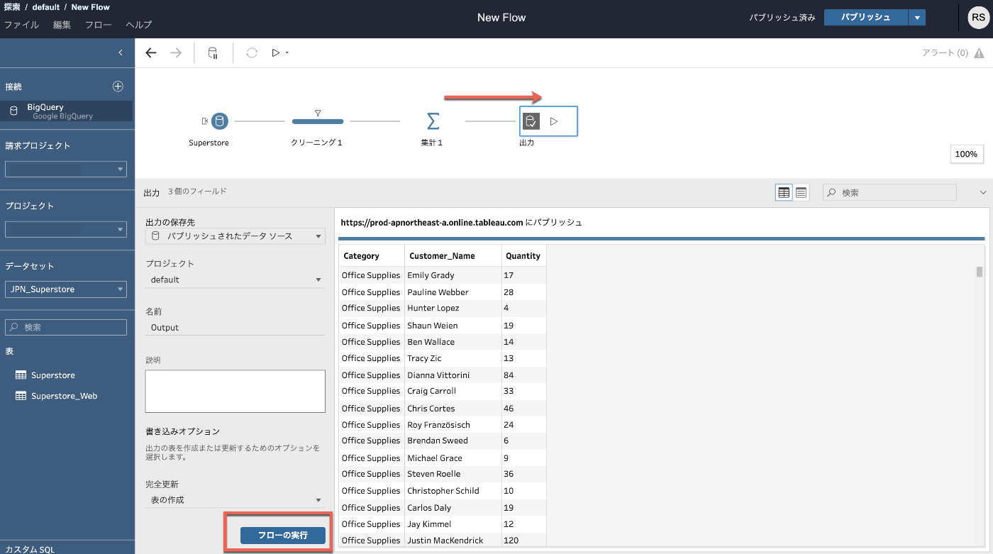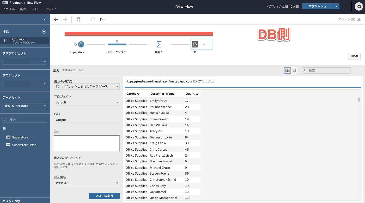 Tableau Prep のフローを完成させてしまえば、DB側に処理をプッシュダウンさせることができるため、BigQuery やSnowflake といった高速なクラウドDWHを使った場合は快適なフロー実行と更新が期待できます。