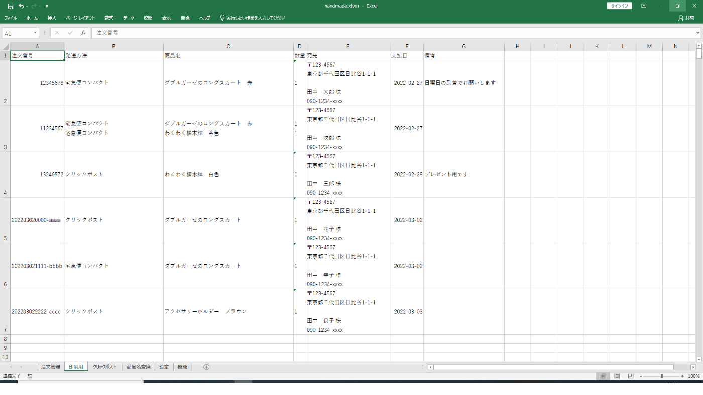 私は印刷用タブを印刷してチェック表として使ったり、発送先の部分を切り取って宛名として張り付けるなどの運用をしています。