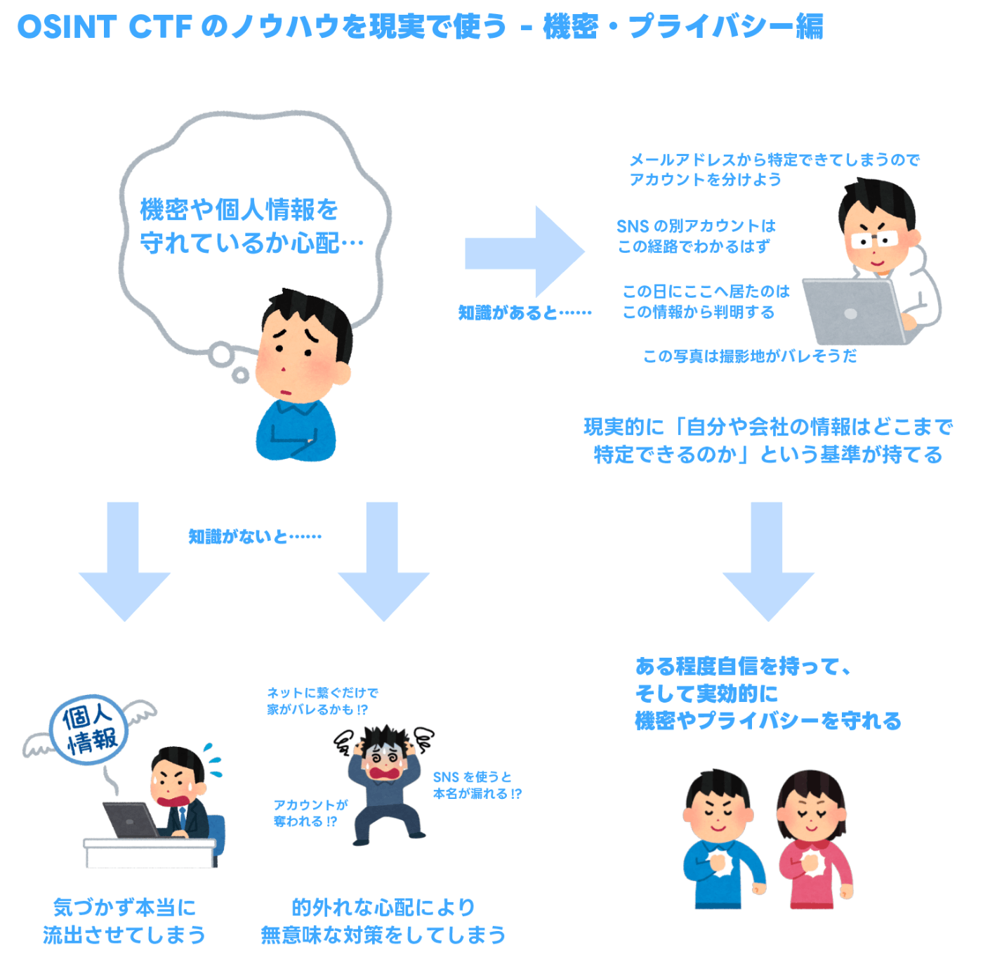 また、OSINTに限りませんが、セキュリティ分野の手法は悪用が可能です。攻撃手法を知らないと防衛できない訳ですが、それは同時に「防衛できる人は悪用できうる知識を持っている」状態でもあります。あなた自身が危険な行動を取らないことも重要です。きちんと倫理観を持つようにしてください。