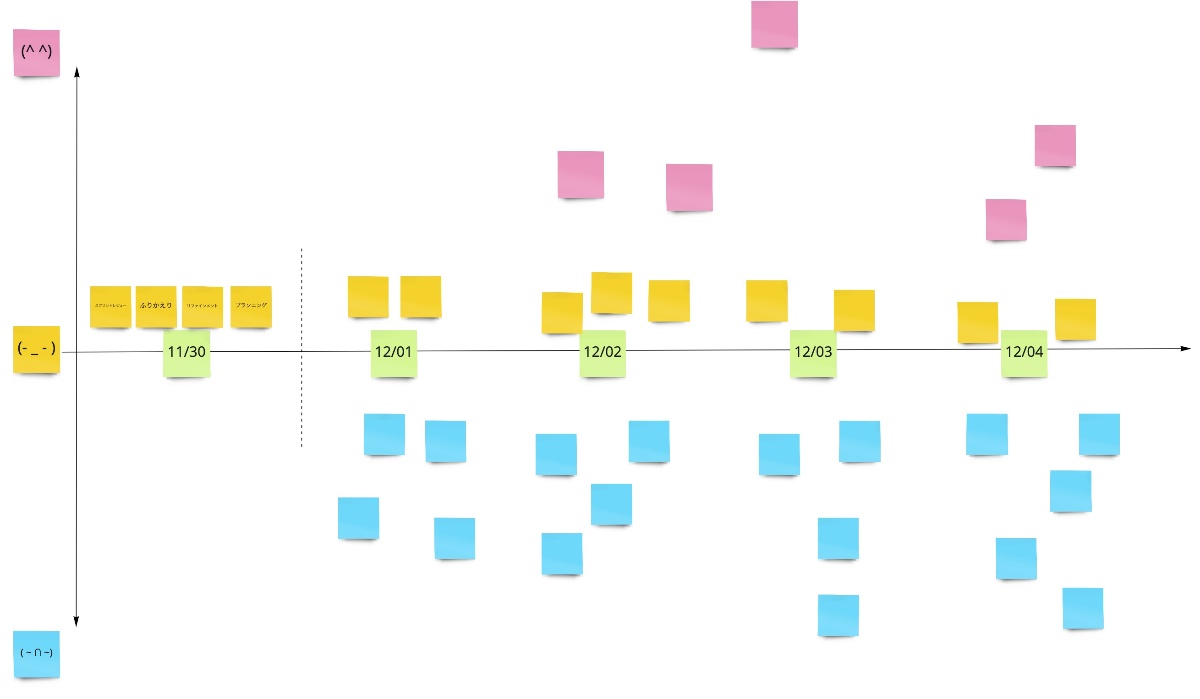 付箋を毎日貼り、ストックしておくことで、今スプリントで何が起きていたかの全体像を把握することができます。