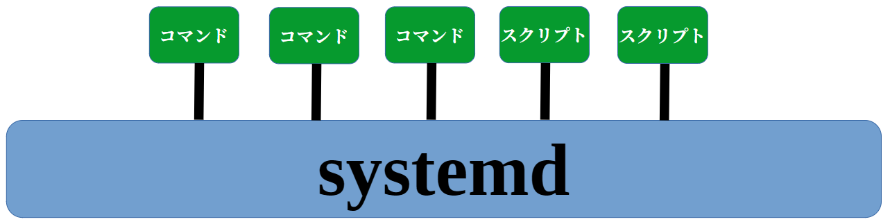 systemd.timerの利便性はログの統一性と実行結果の表示が明瞭であることがありますが、ここで最も重要なのはsystemd.timerの最大の特徴としてcronのような中間管理者が存在しないということです。systemdの上に直接コマンド・スクリプトを置きsystemdが直接管理するという考え方です。この考え方をデーモンレスといいます。