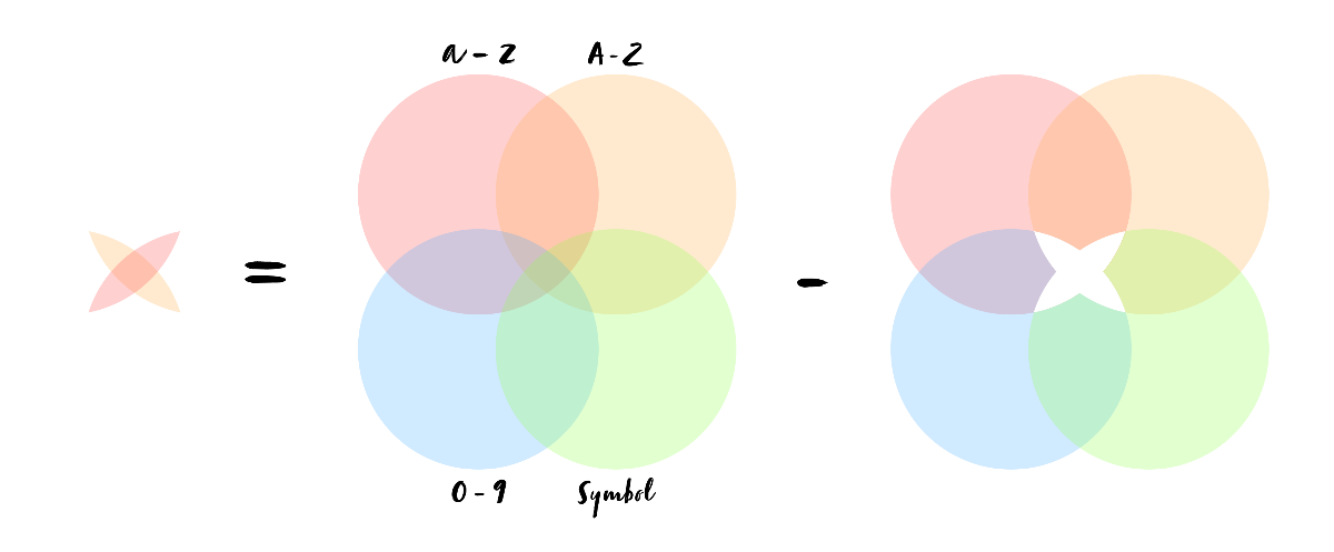 下の図のように、大文字、小文字、数字、指定した記号のいずれかにマッチする文字列の組み合わせ(パターン1)から、大文字、小文字、数字、指定した記号の1つ、もしくは2つの文字タイプの組み合わせ(パターン2)を除くと、全ての条件のみを満たした文字列のみがマッチします。