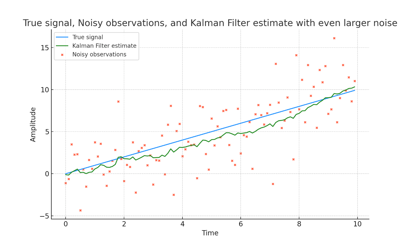 ノイズの大きな観測データに対してカルマンフィルタを適用し、信号を推定します。