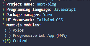 JavaScript, Yarn, TailwindCSS, Content(nuxt/content), Universal, Staticを選択します。途中LinterやTestについて聞かれますがここはお好きなように選択してもらって構いません。