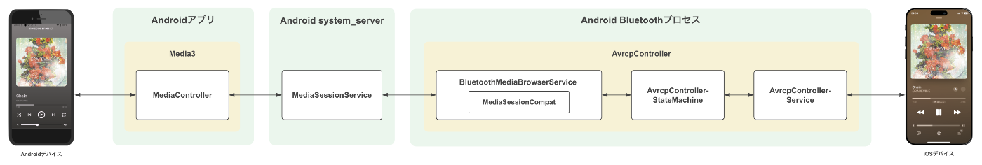 実装の全体像は上図になります。AVRCPでBluetooth接続した外部デバイスと連携するMediaSessionは、com.android.bluetoothというシステムプロセスがホストするBluetoothMediaBrowserServiceで公開されています。これらの実装の詳細は、下記のAOSPリポジトリで確認することができます。