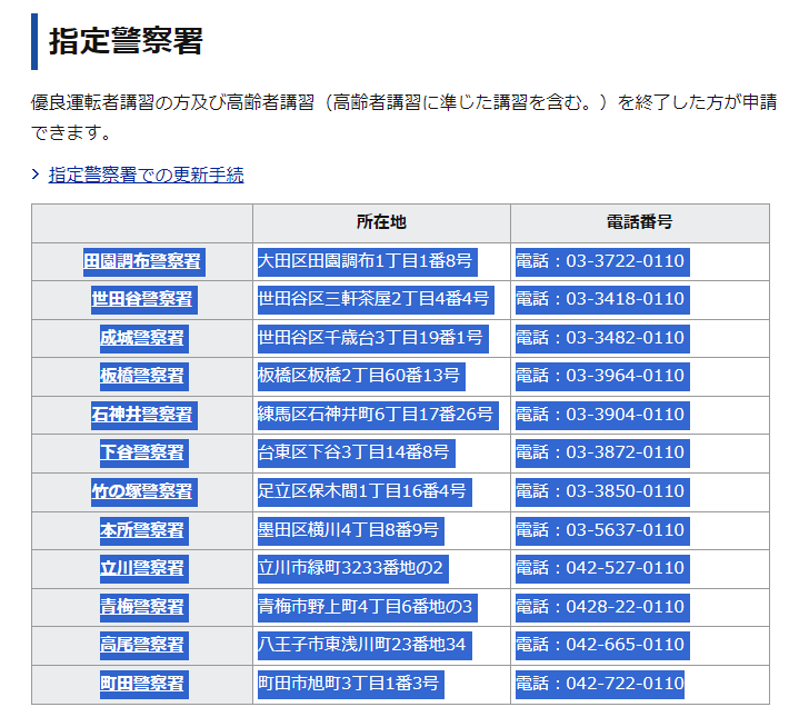 例えば、東京都内で運転免許の更新ができる指定警察署を調べるとだと、警視庁のページでは以下のように表示されています。これをガバっとコピーして Dokoda に入力すると何も整形せずともマッピングしてくれます。