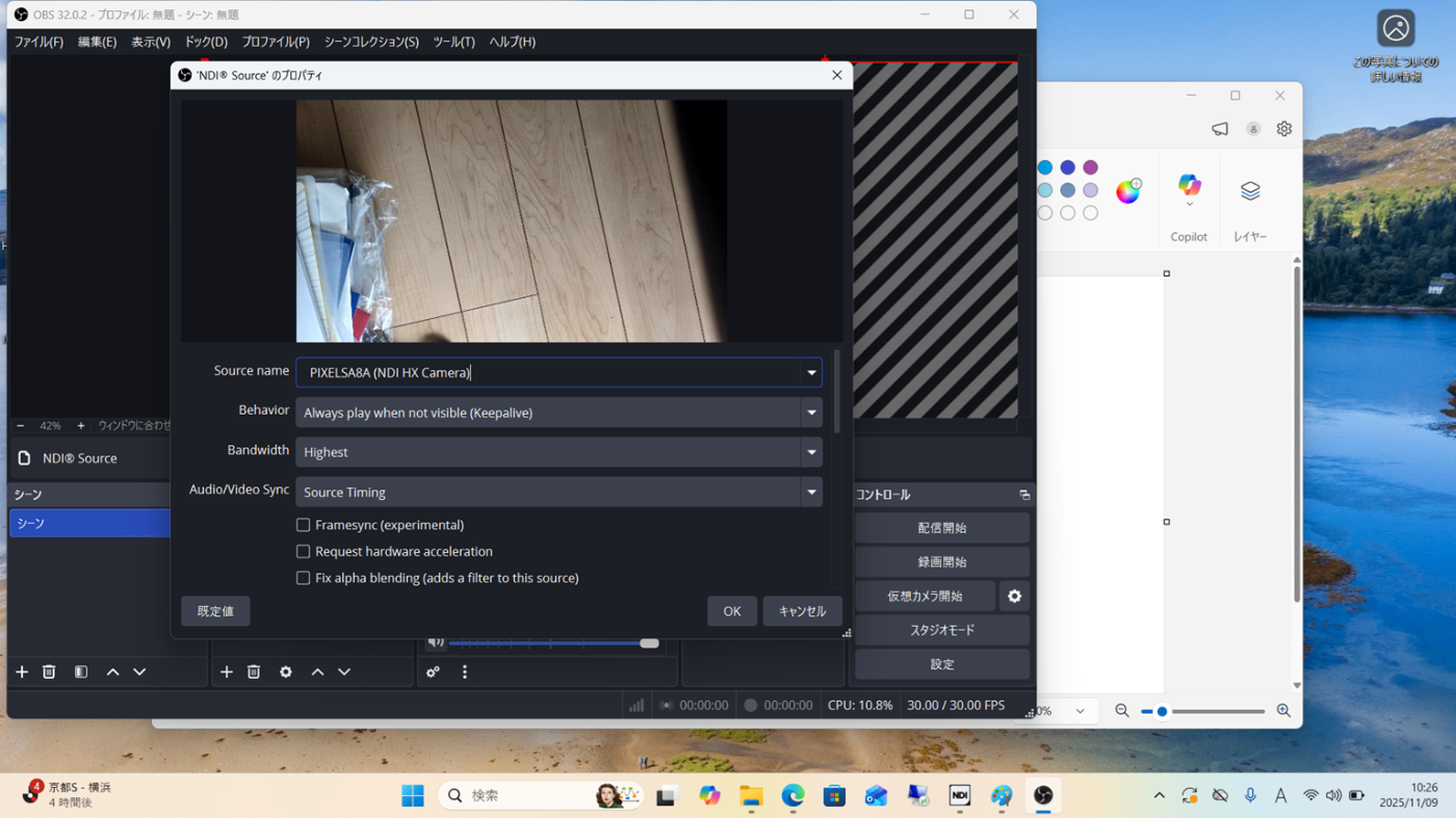 プロパティからNDIソース(今回はPixel8a)を選択し、映像が表示されれば完了。