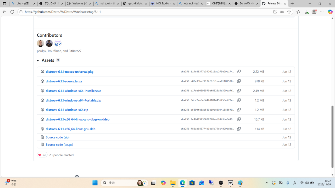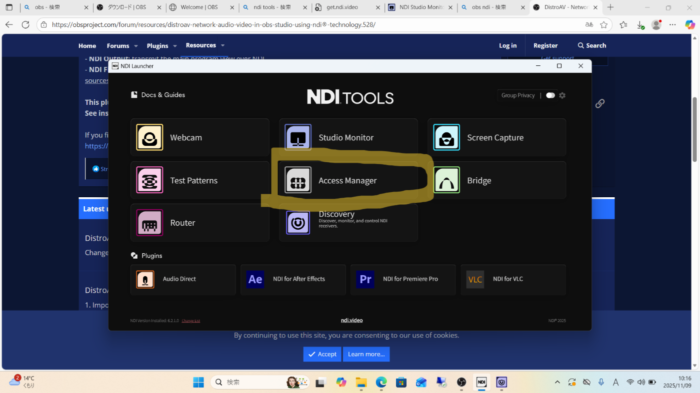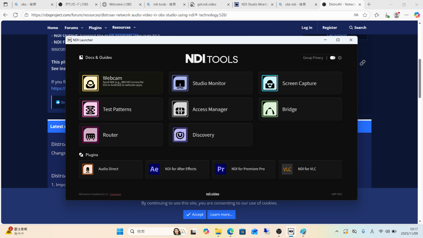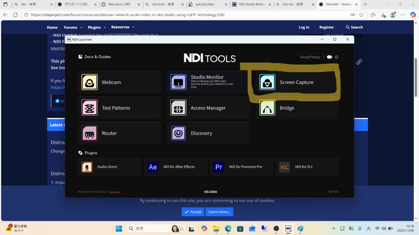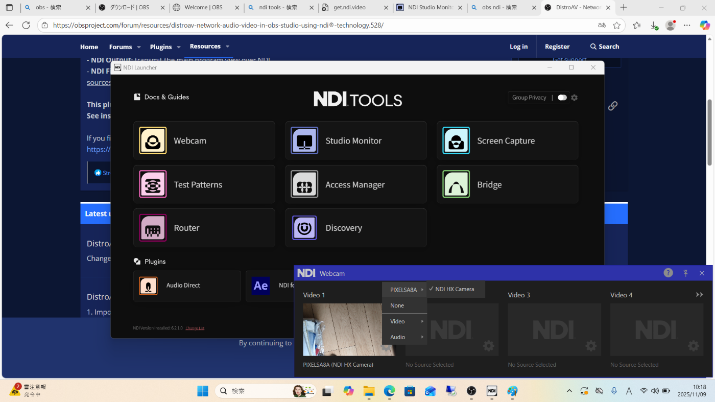 DistroAVをインストールする。これはOBSにNDIソースを入力するために必要なプラグイン。