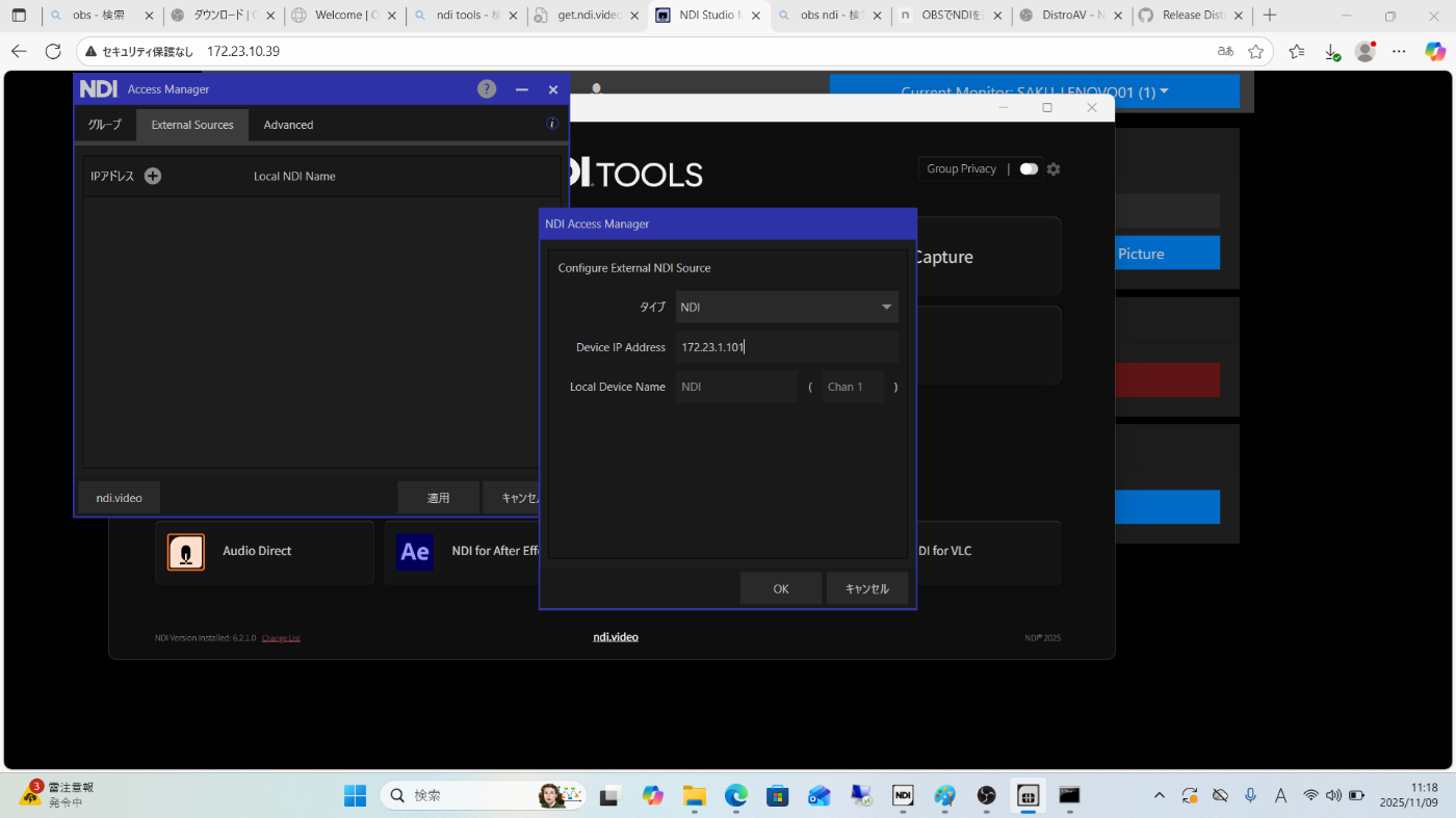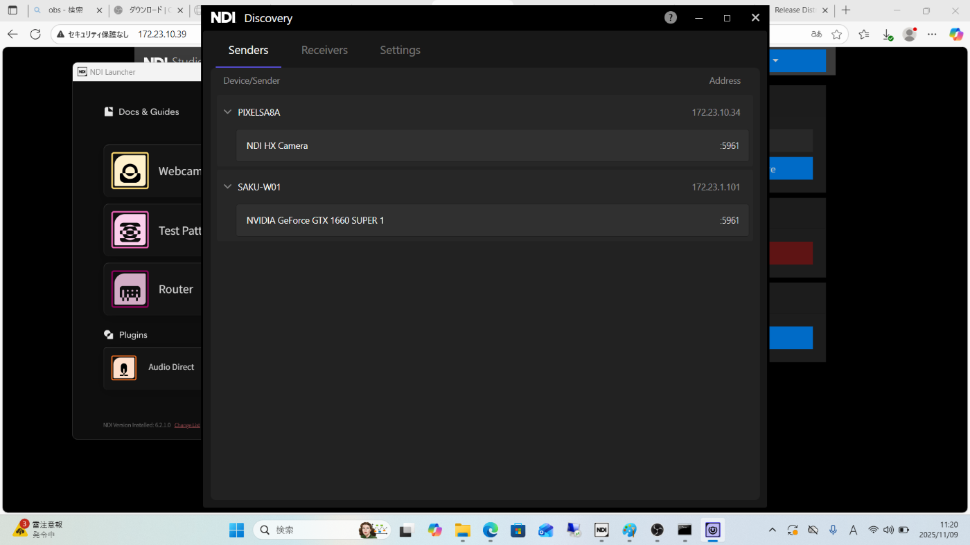 別セグメントでのNDIを使った映像・音声伝送を実施。先ほどのスマートフォンの映像・音声と別セグメント上のPCの画面キャプチャをOBSに入力する。