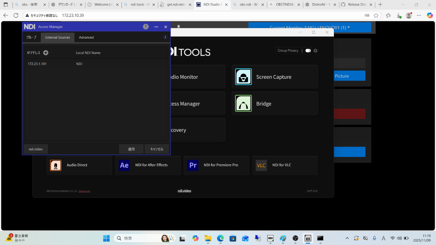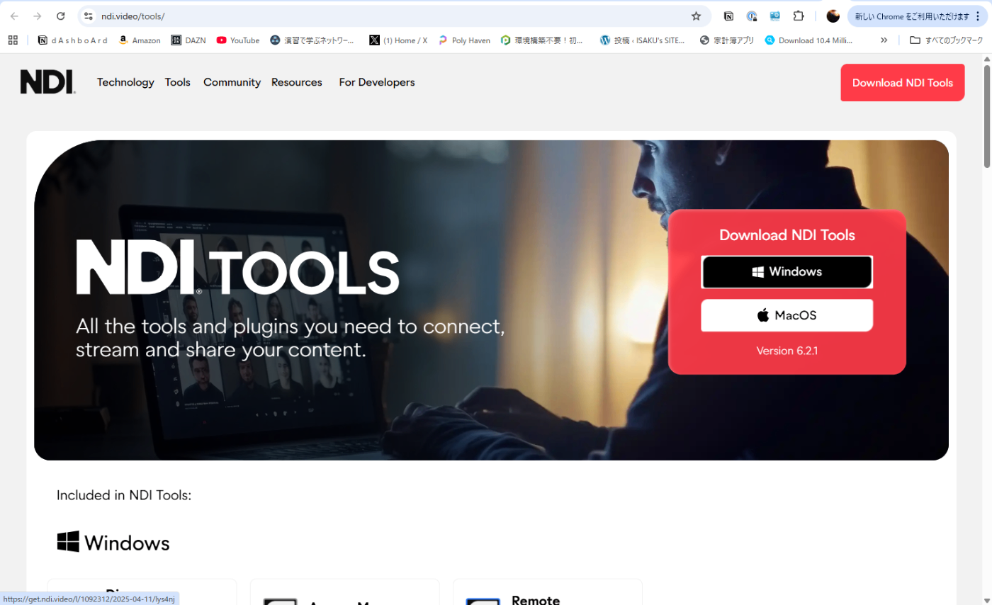 https://ndi.video/tools/ より、NDI Toolsをダウンロードする。今回はWindows版。
