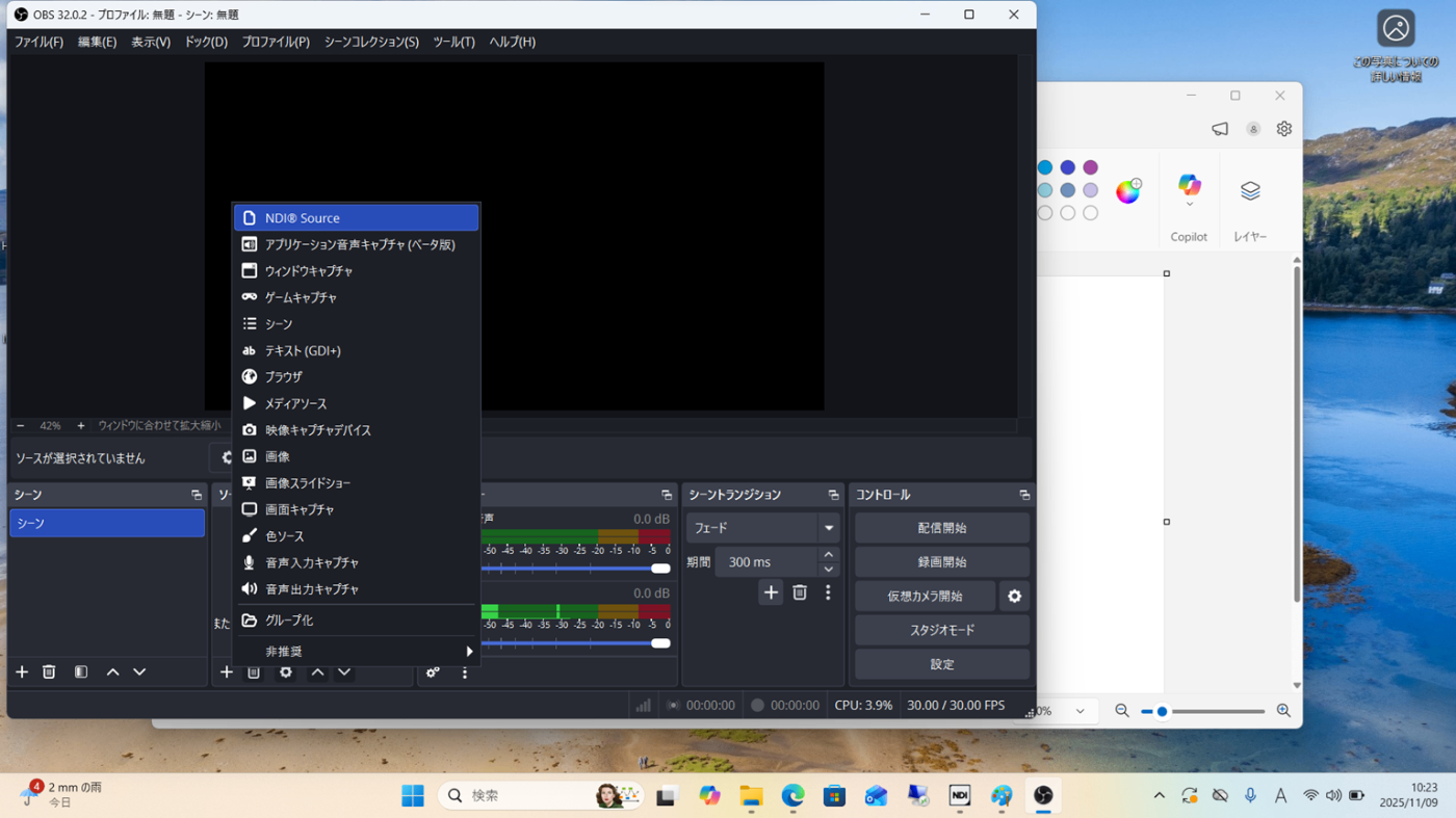 OBSを起動し、ソースとして「NDI Source」を選択。