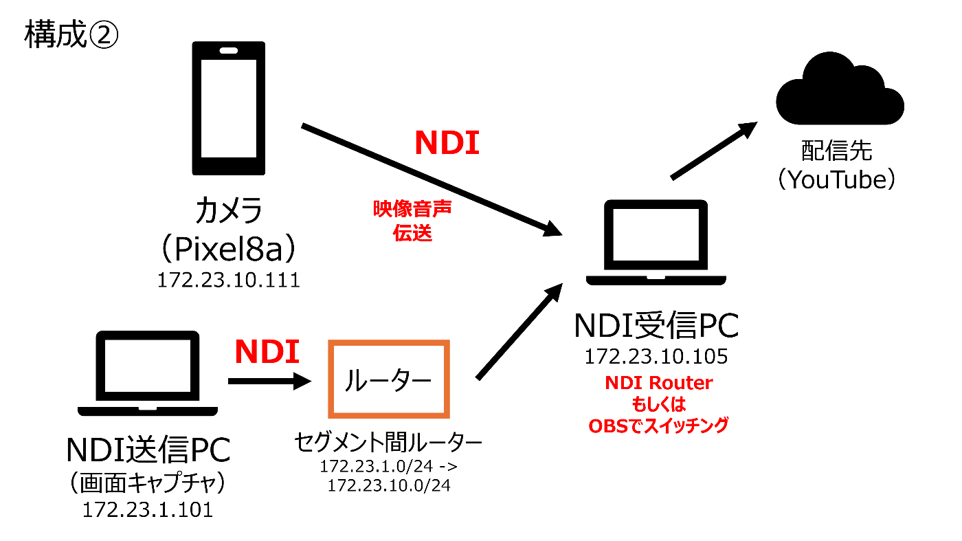 同セグメントでのNDIを使った映像・音声伝送を実施。