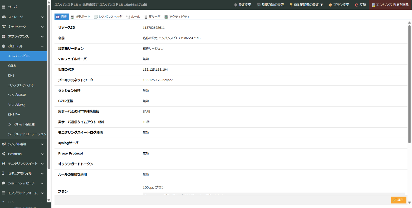 まずは以下のエンハンスドロードバランサーのVIPに対してドメイン名(Aレコード)を設定しアクセスを行えることを確認します。