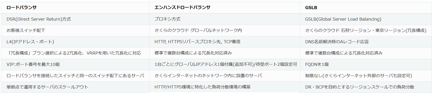 エンハンスドロードバランサ:HTTP(S)に特化しています。さくらのグローバルネットワーク上で動作するためゾーンをまたいで有効です。