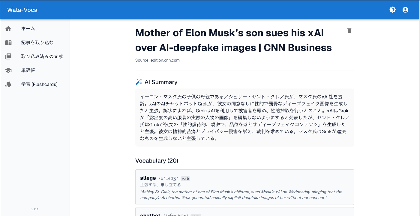 【個人開発】英語記事から自分だけの単語帳を作るAIアプリ「Wata-Voca」をリリースしました
