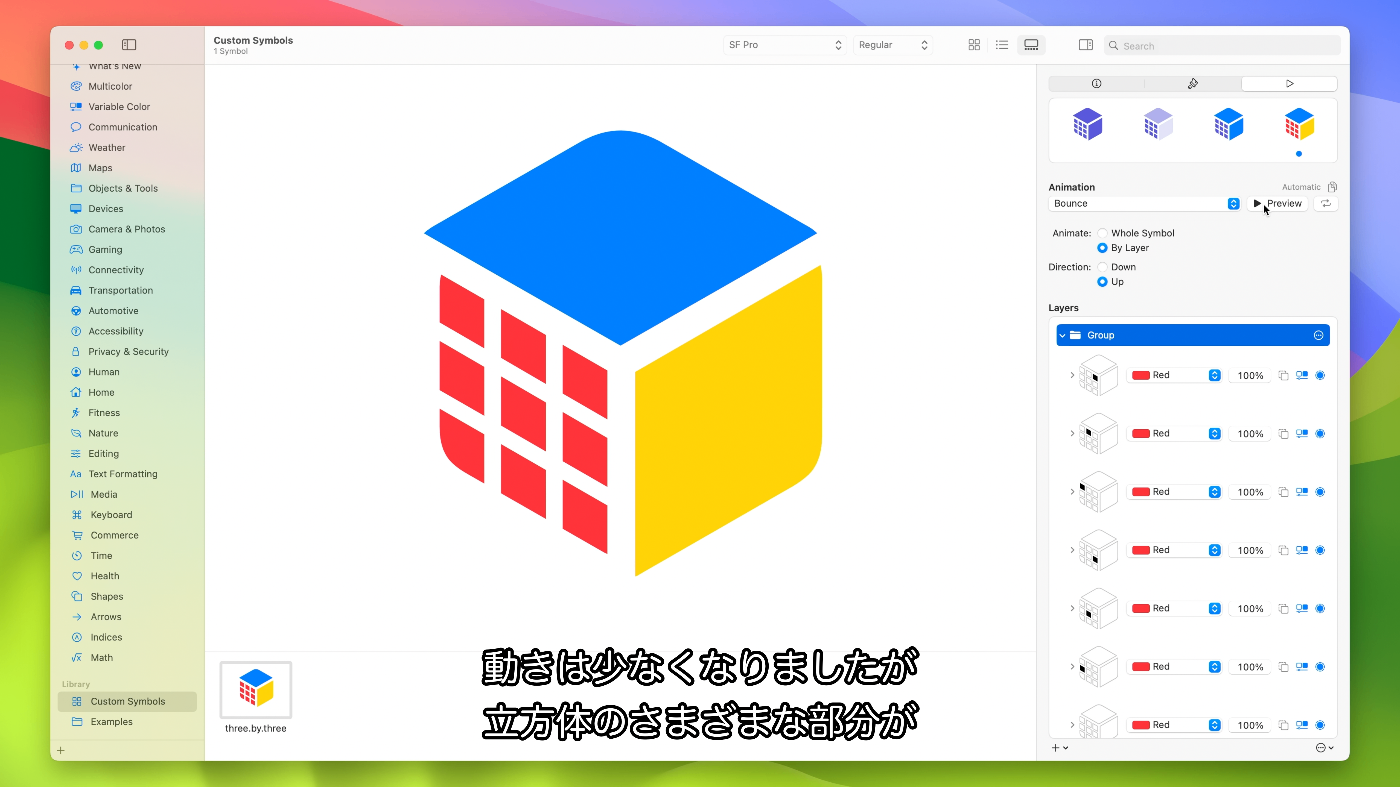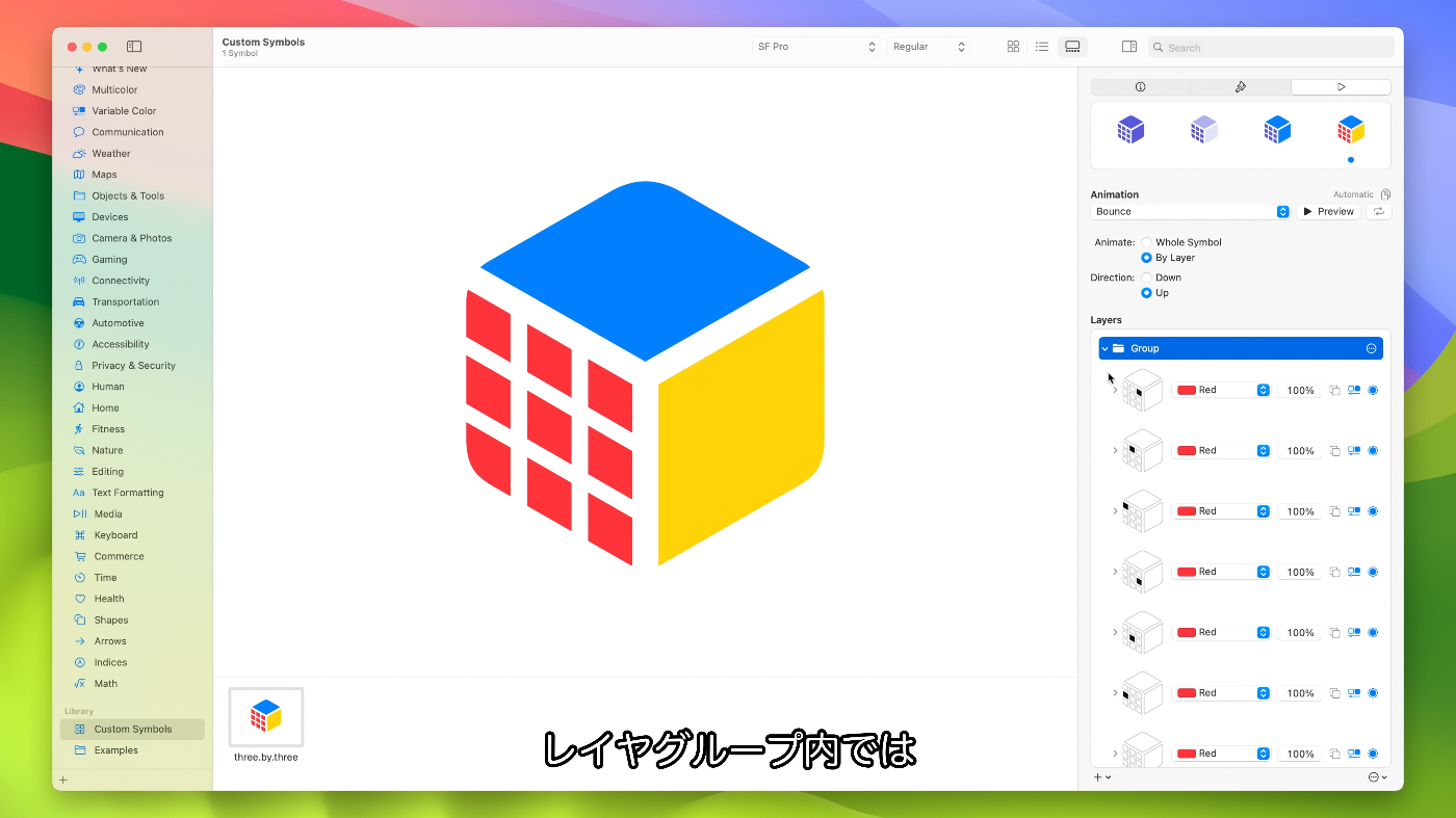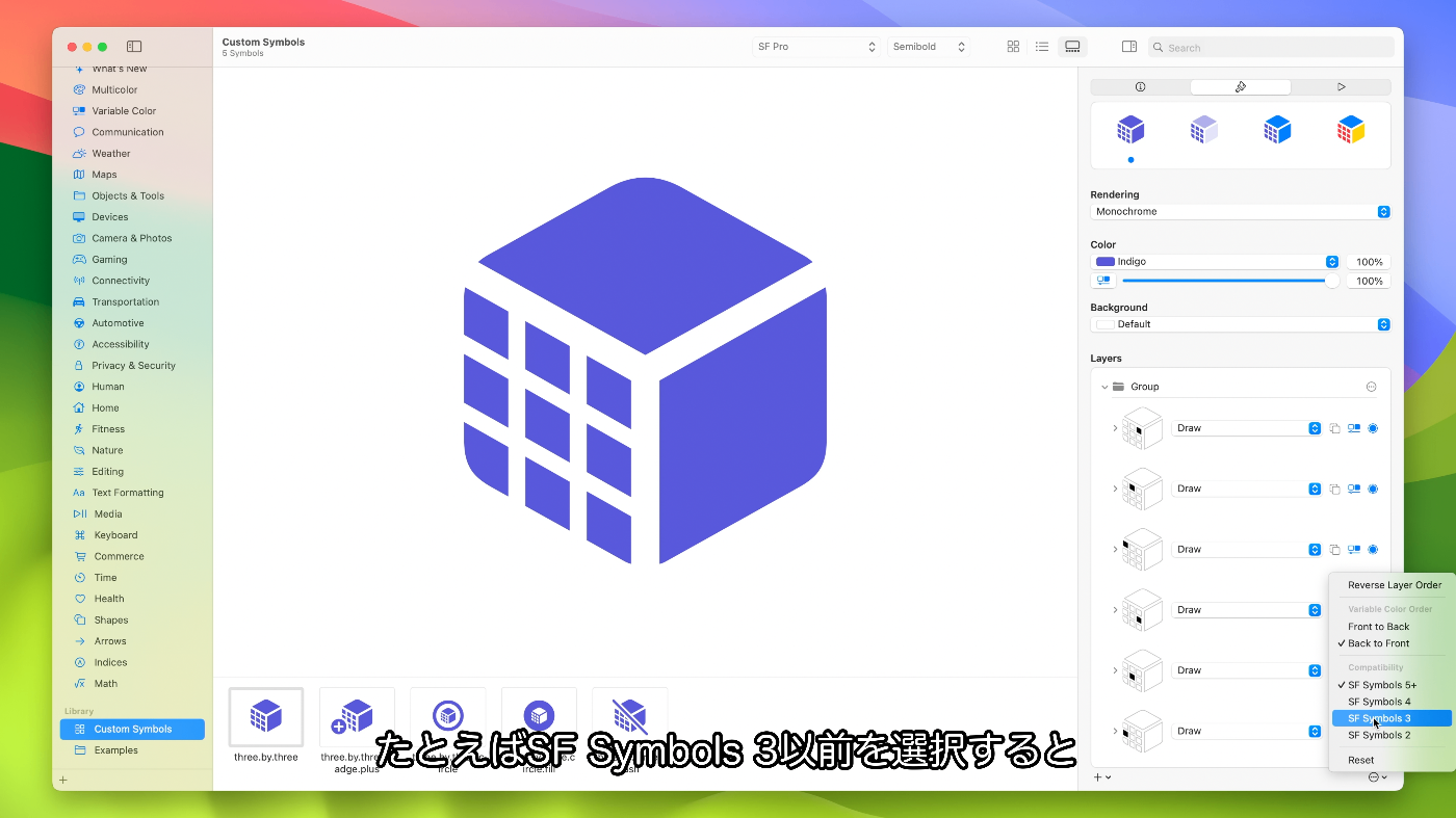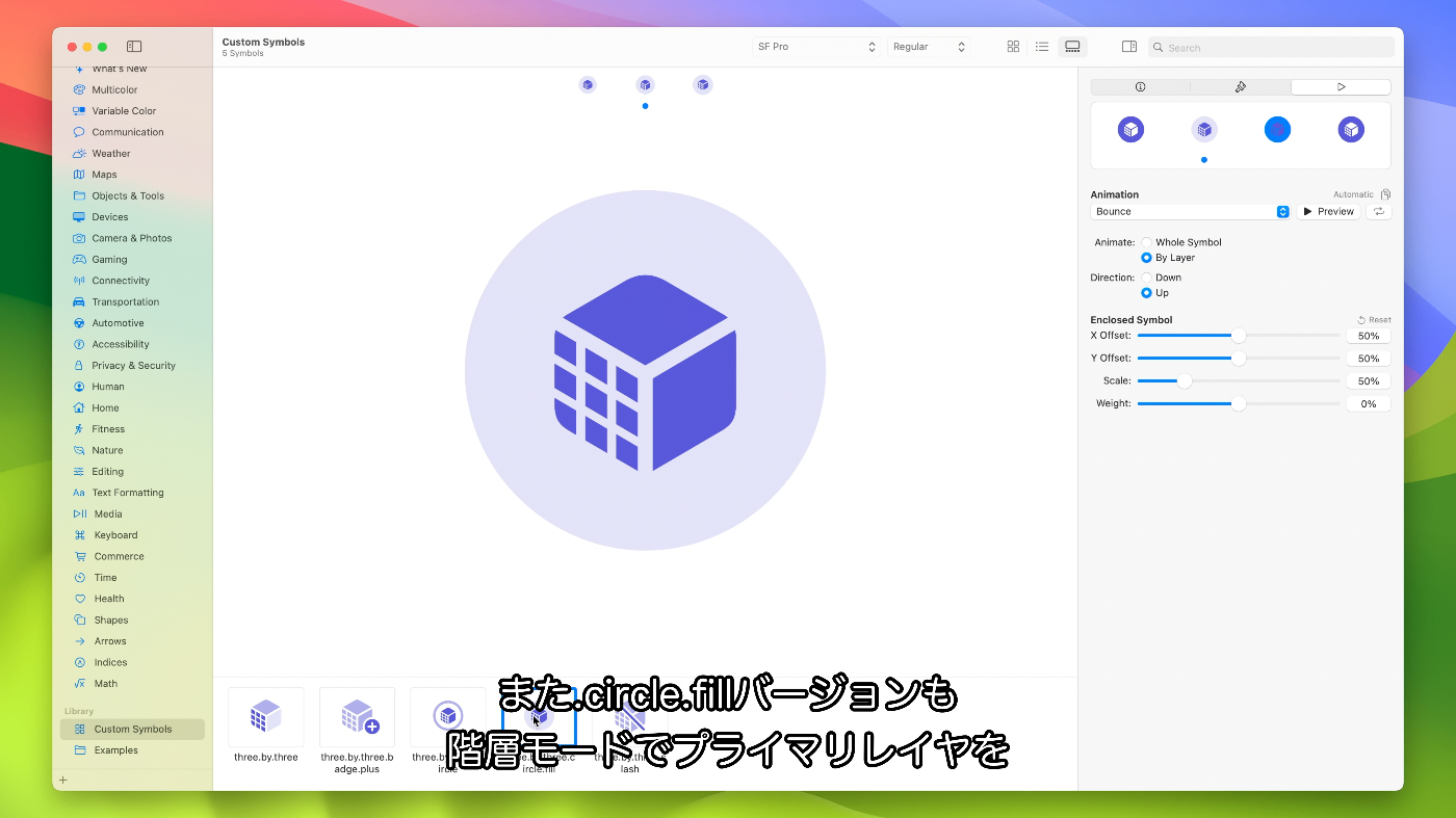 - iOS 15やmacOS Montereyに対応のSF Symbols 3をターゲットにしている場合、モーションに使用するレイヤ構造によりSF Symbols 3では完全サポートされて最適化されていない単純な描画が得られる