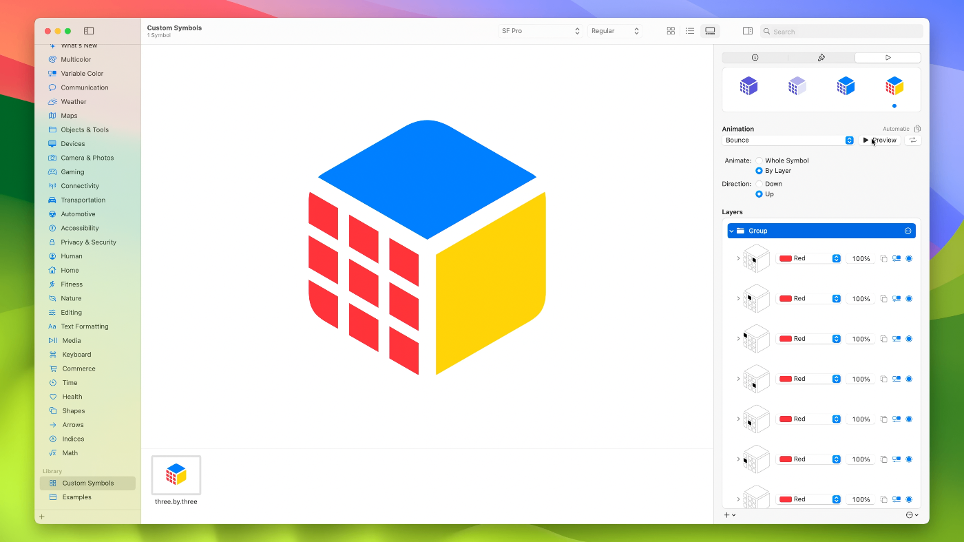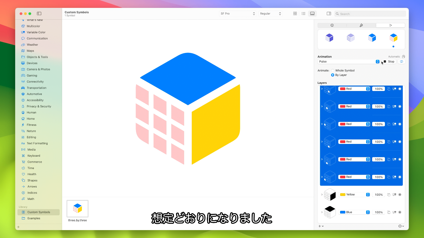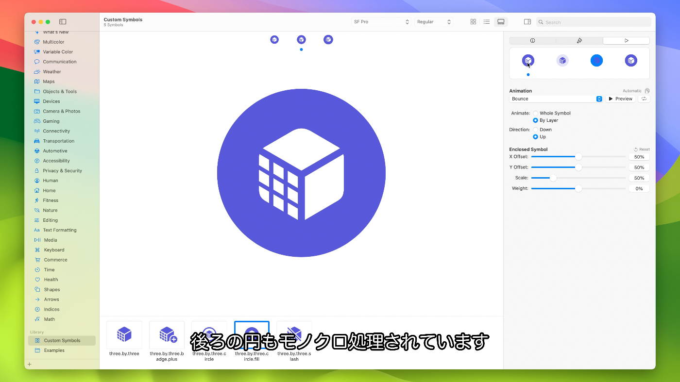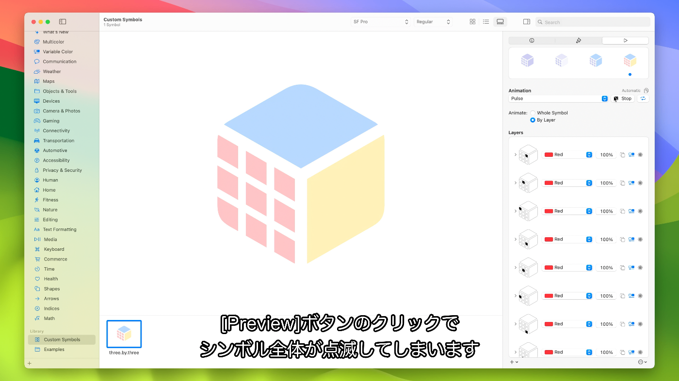 - iOS 15やmacOS Montereyに対応のSF Symbols 3をターゲットにしている場合、モーションに使用するレイヤ構造によりSF Symbols 3では完全サポートされて最適化されていない単純な描画が得られる