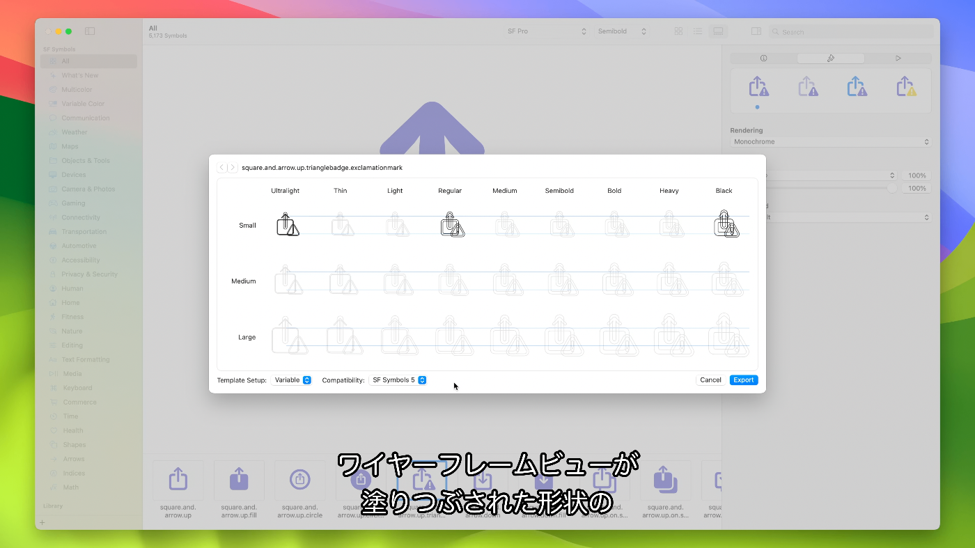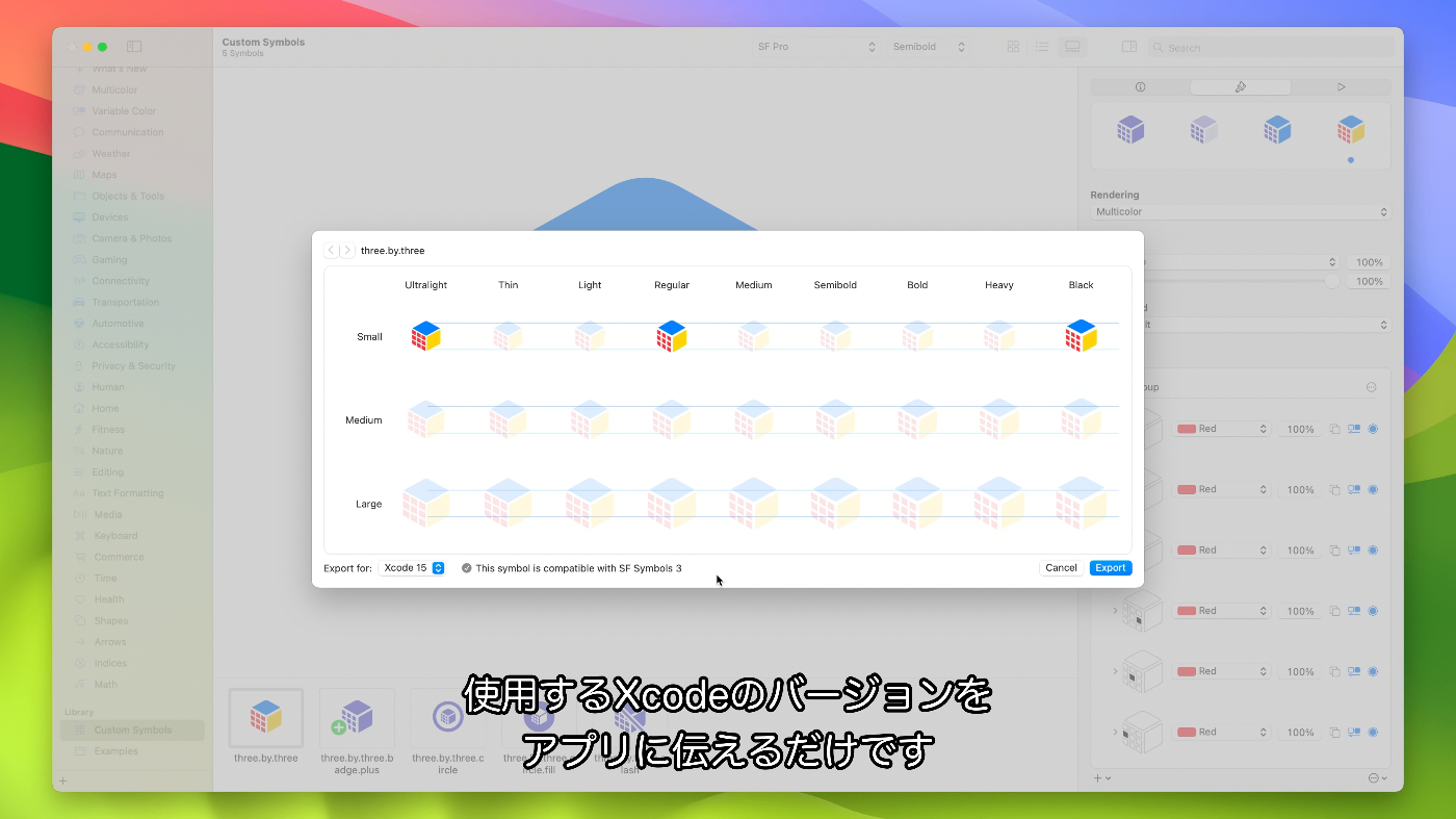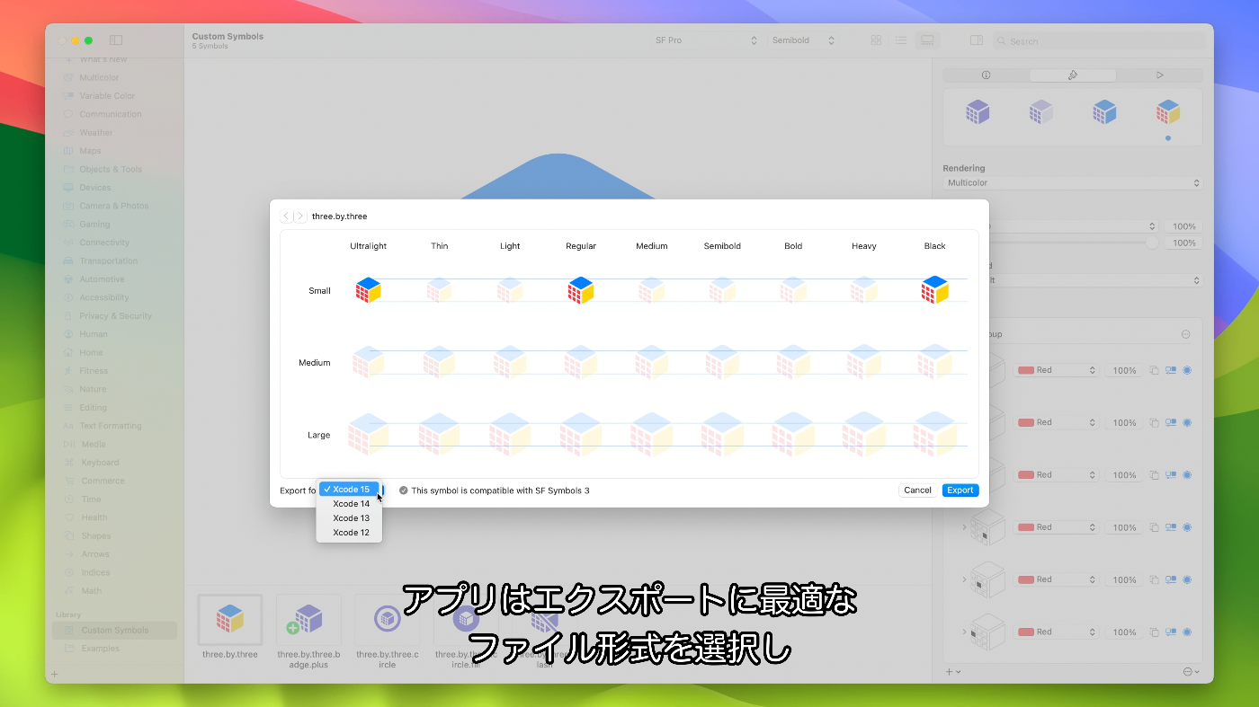- Xcode 15で使用するために、このバージョンのSF Symbolsのバージョン5からエクスポートする