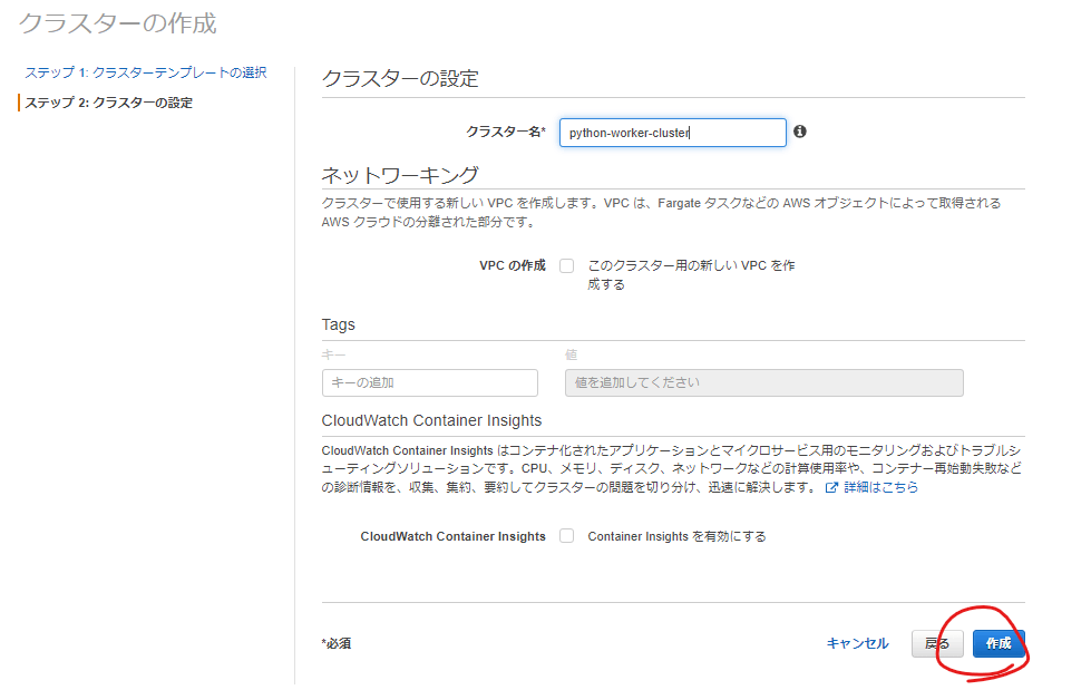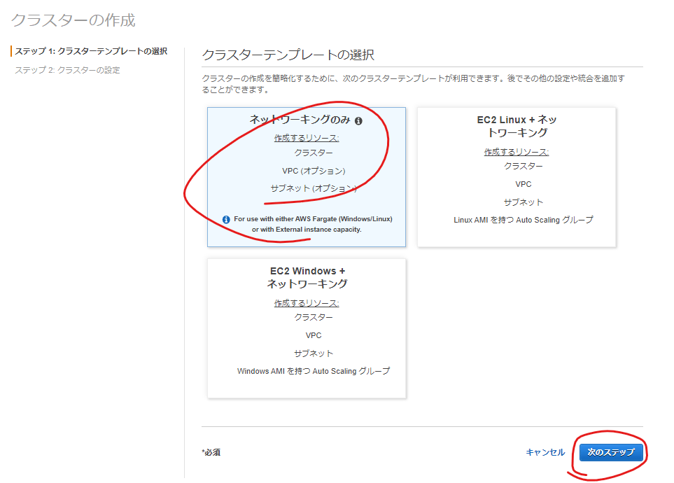 Fargate用のテンプレートを元にECSクラスタを作成します。