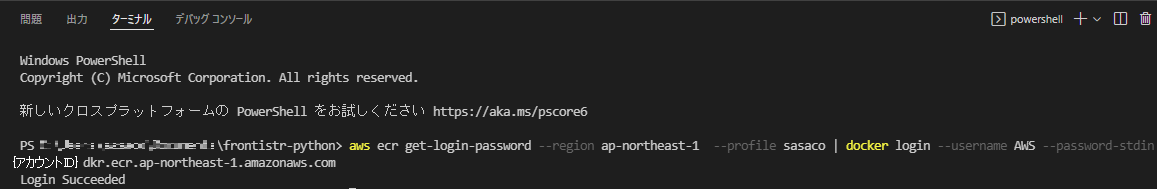 aws ecr get-login-password --region ap-northeast-1 --profile sasaco | docker login --username AWS --password-stdin {アカウントID}.dkr.ecr.ap-northeast-1.amazonaws.com