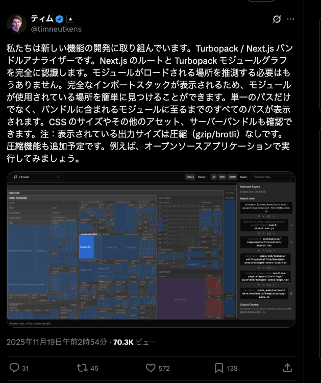 このコマンドは、Tim Neutkens氏のツイートで紹介されたように、Next.jsルートとTurbopackモジュールグラフを意識したバンドルアナライザーで、モジュールのインポートスタックをすべて表示し、バンドルへの包含パスを簡単に追跡できます。また、CSSサイズや他のアセット、サーバーバンドルも分析可能で、出力サイズは現在圧縮なしですが、将来的にgzip/brotli対応が予定されています。