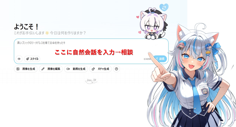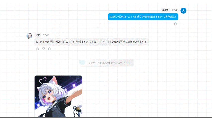 10月のミオエージェント実装により、プロンプト・エンジニアリングは相談することができるようになりました。特にアイデアがまとまっていない段階からでも、創作の方向性をサポートしてくれます。編集もそのままチャットフォームから可能です。
