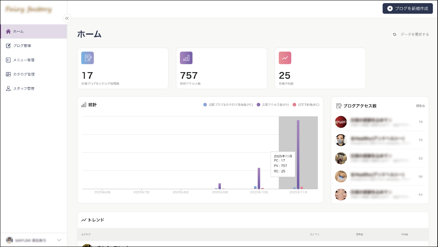 (こちらは、サロン向け画面のホーム画面になります)