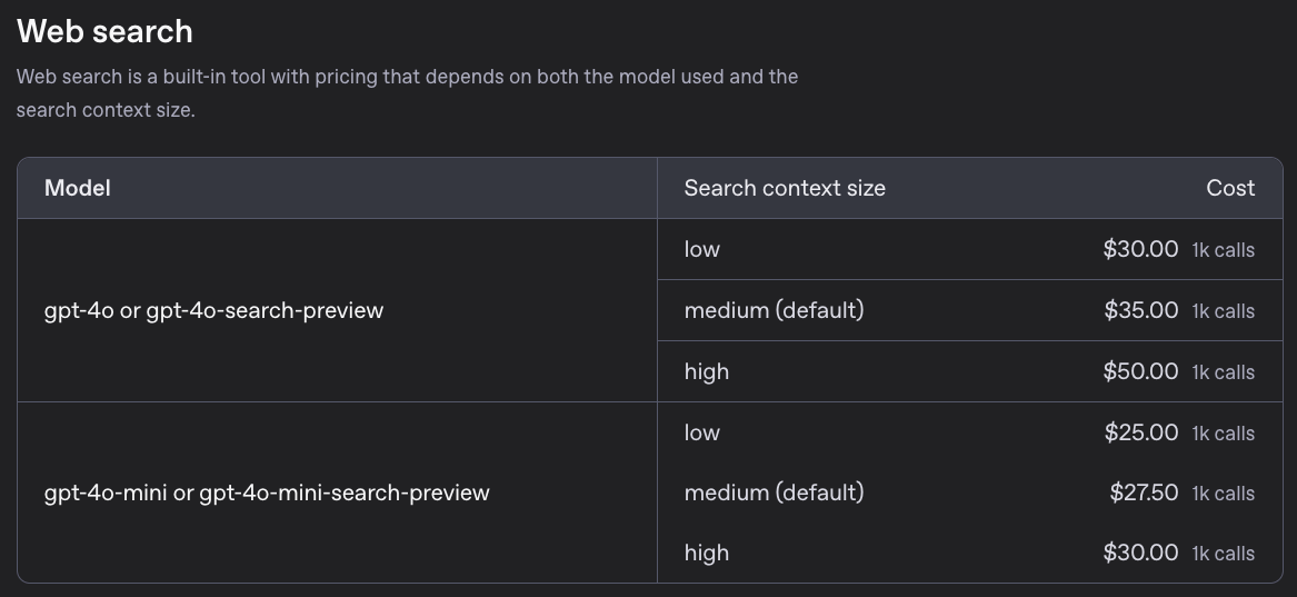 ウェブ検索は Context Size を low / medium / high から選べて、デフォルトは medium が適用される。個人的には 4o / 4o-mini で正直あんまり変わらないという印象を持ちました。