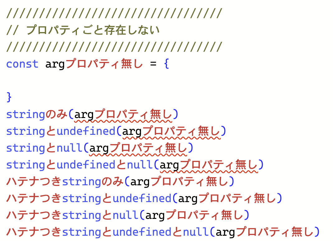 最後に、そもそもプロパティが無いものをいれてみましょう。ハテナがついていないものは全てエラーになってしまいました。
